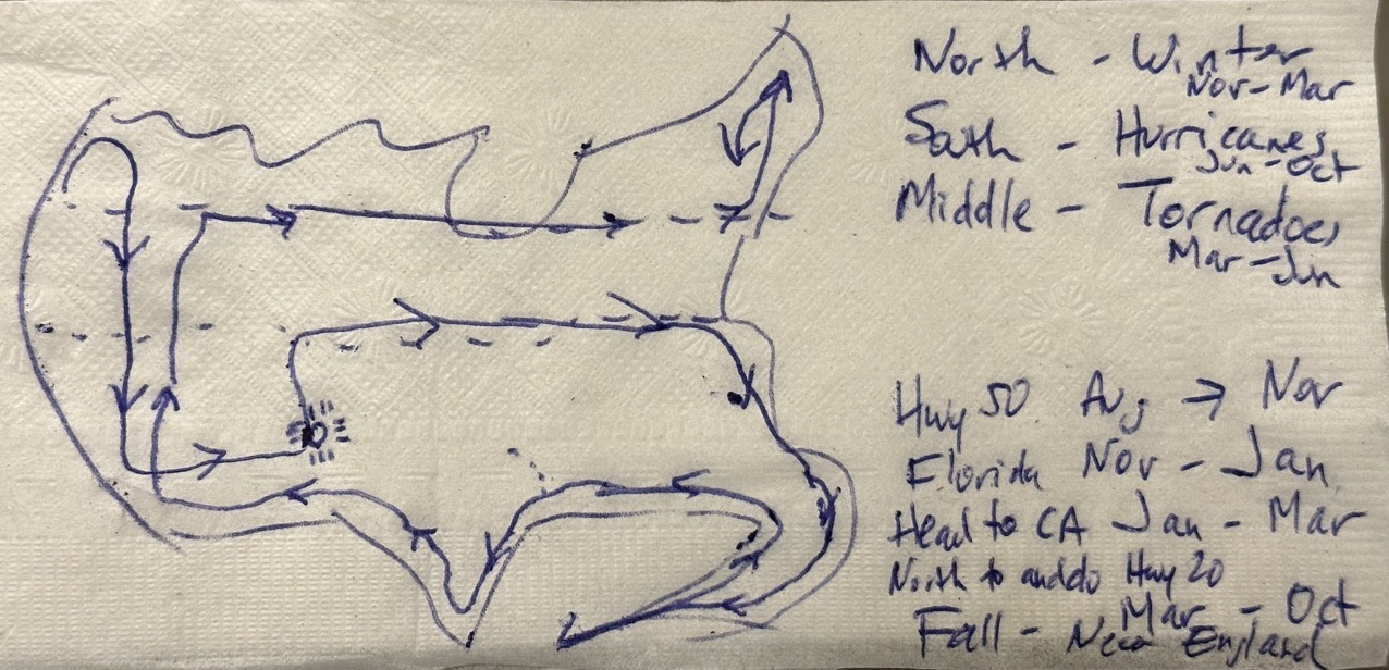 A few months ago we sketched out our travel plans for the next year or so on a napkin and that should give you some idea of our plans.